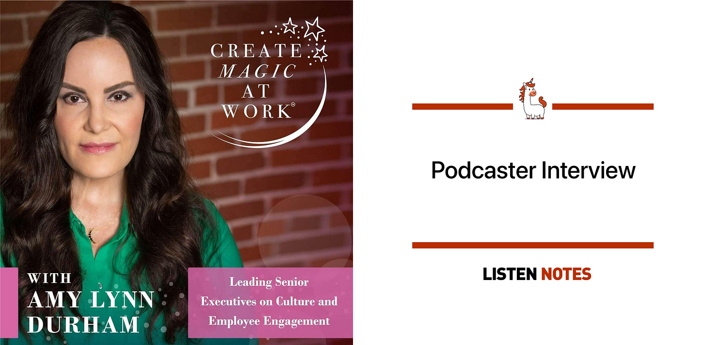 Over the past four and a half years, the podcast has steadily grown an engaged audience. According to Listen Notes, Create Magic At Work® is currently ranked in the Top 5% of podcasts globally. That growth has come through consistent publishing, thoughtful conversations, and a focus on topics that resonate deeply with leaders who are looking for more meaning in their work and lives.